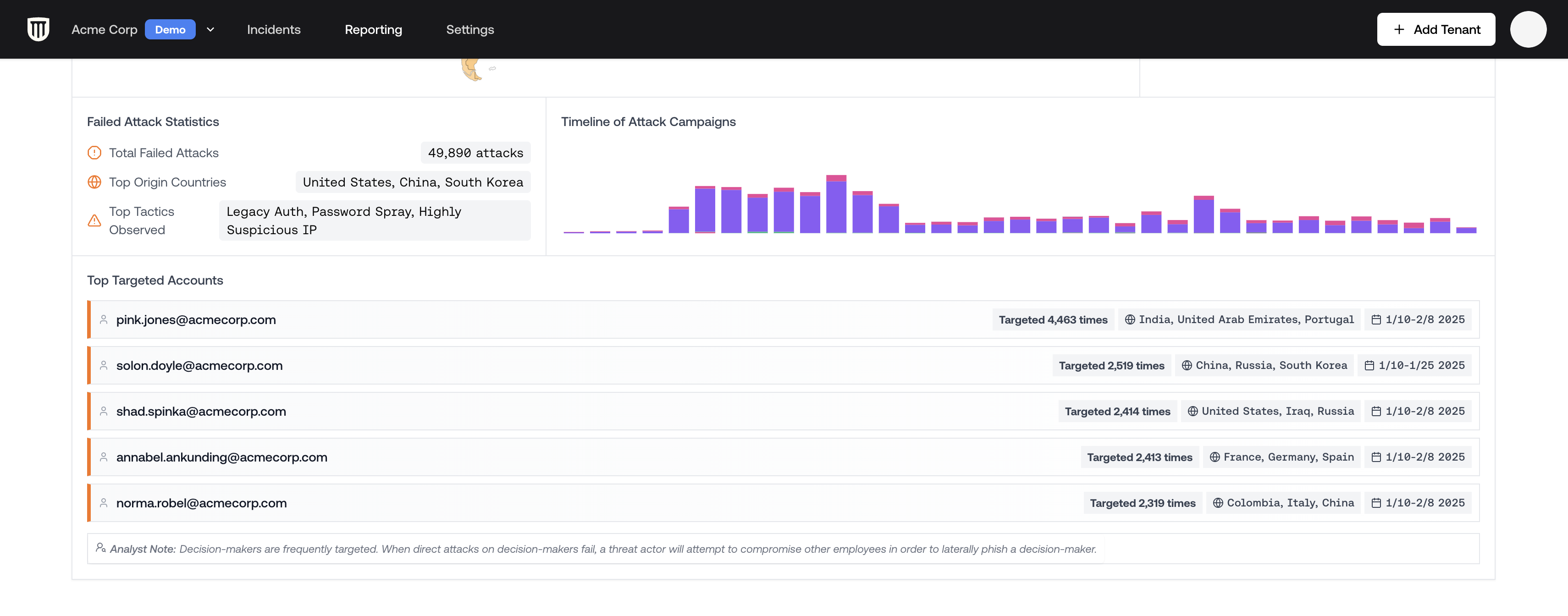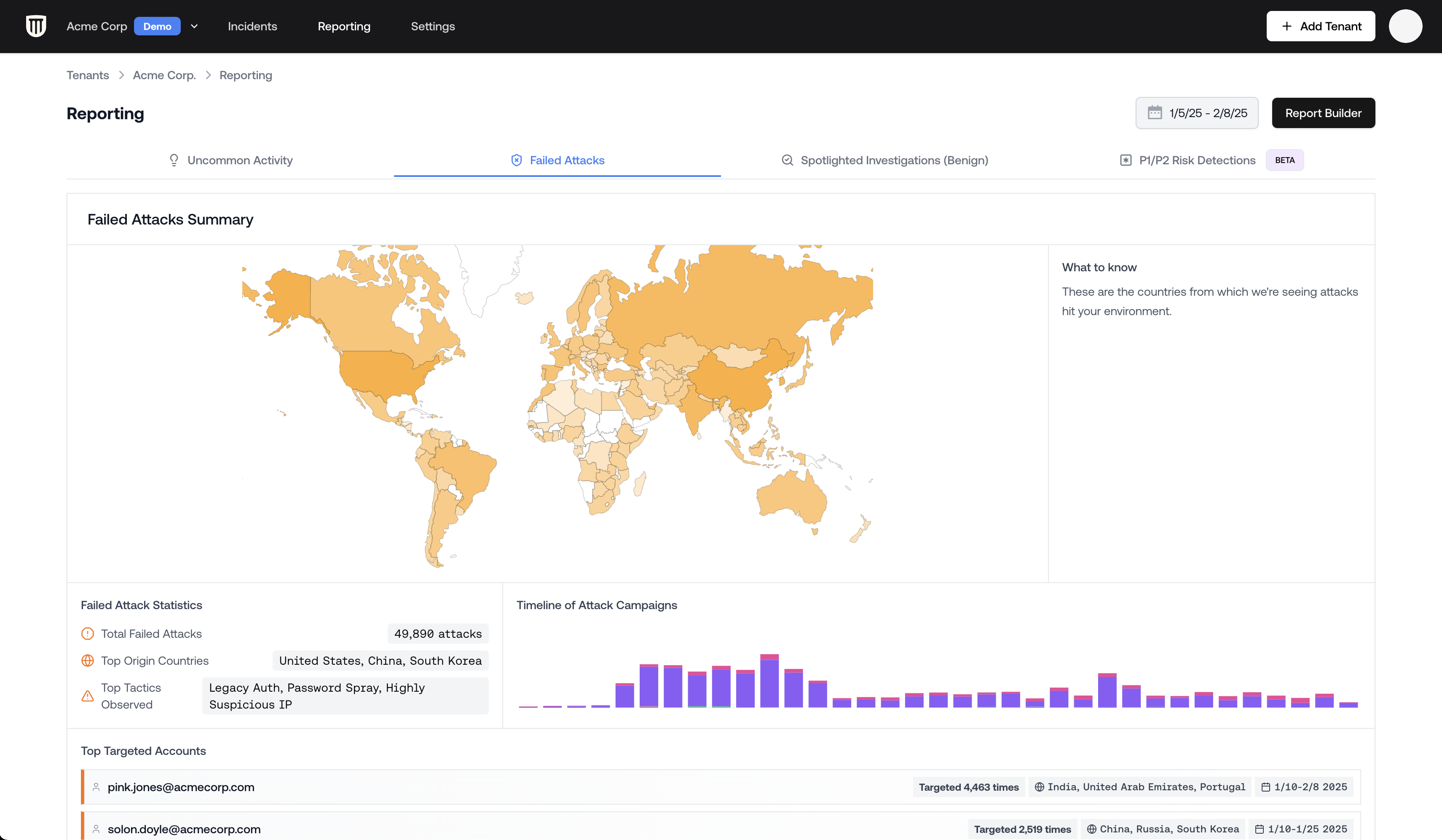The Failed Attacks tab provides visibility into unsuccessful login attempts targeting your organization’s M365 environment. This allows you to:- View geographic distribution of attack attempts